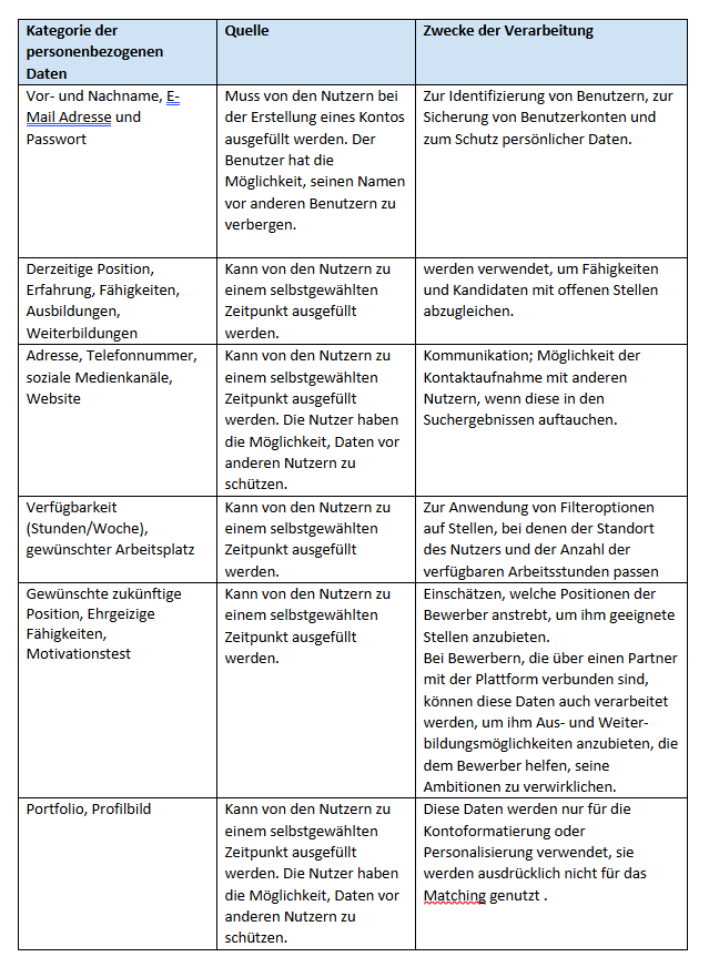 • Ausführung einer Vereinbarung: Der Abgleich zwischen Angebot und Nachfrage erfolgt bei der Ausführung unserer Dienstleistungen für Bewerber und Organisationen oder bei der Ausführung einer Vereinbarung. Die von den Nutzern auf der Plattform eingegebenen personenbezogenen Daten werden auf der Grundlage einer Vereinbarung verarbeitet, die sie bei der Einrichtung ihres Kontos digital unterzeichnet haben.