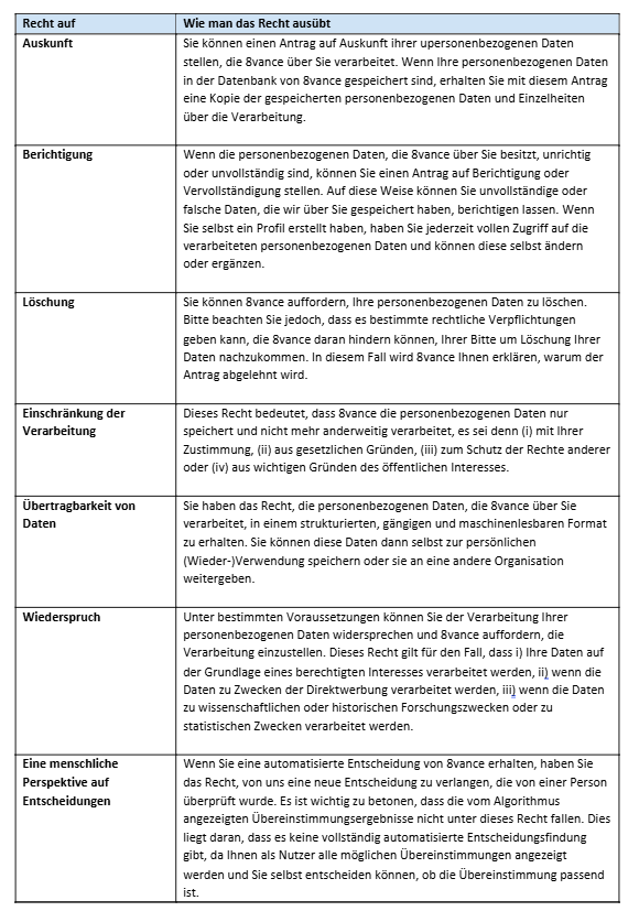 Die Nutzer von 8vance haben und behalten die volle Kontrolle über ihre eigenen personenbezogenen Daten und können das Matching jederzeit deaktivieren, die Sichtbarkeit und andere Datenschutzeinstellungen anpassen oder ihr Konto löschen. Darüber hinaus haben Sie einige Datenschutzrechte, mit denen Sie sicherstellen können, dass relevante personenbezogene Daten nicht länger gespeichert werden. Weitere Erklärungen finden Sie im Abschnitt „Ihre Rechte nach dem AVG“.